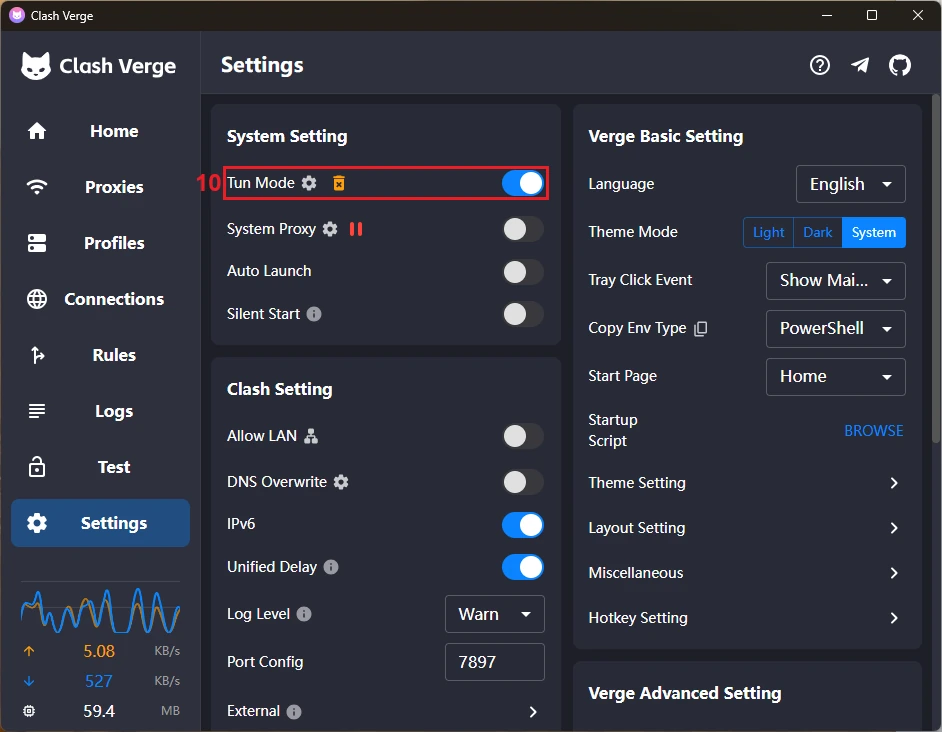 11. 进入设置 Settings ,在系统设置 System Settings 部分启用Tun模式 Tun Mode (10)。