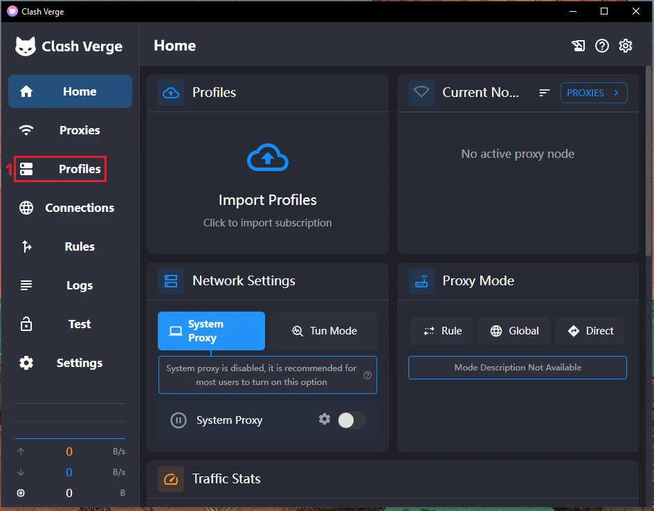 - 运行Clash Verge Rev应用程序。您会看到如下界面。如果该应用程序无法在Windows上运行,请点击这里下载Microsoft Edge WebView2 Runtime安装。
