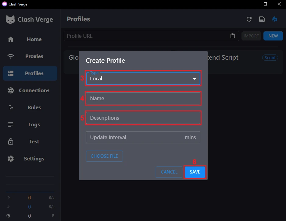 4. 在创建配置文件Create Profile 窗口,选择配置文件类型为本地 Local (3) 。输入您要用的名称 name (4) ,还可按需填写描述 description (5) 。您也可以添加HTTP请求超时时间,为可选项。点击保存 Save (6) 保存配置文件。