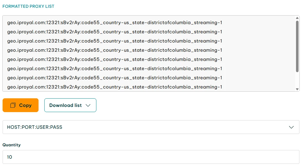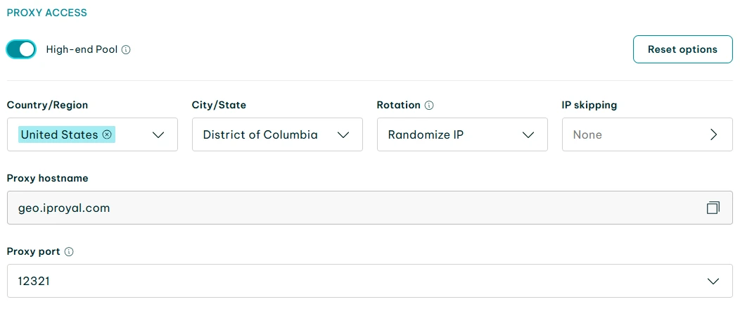 7. 现在转至IPRoyal 控制面板,配置要用的代理服务器。示例中,我们用的是美国哥伦比亚特区的高端住宅代理。