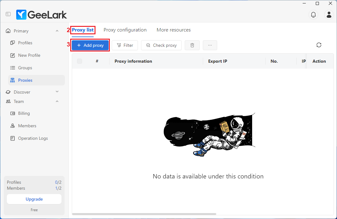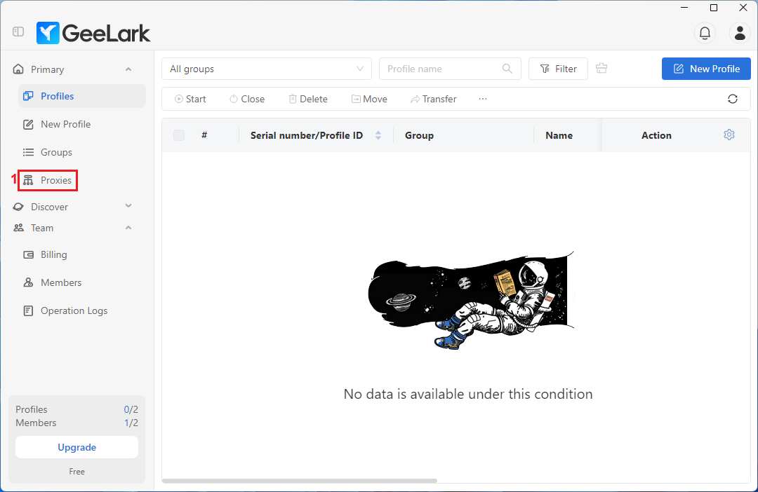 1. 启动GeeLark并点击 代理 (1) 按钮。