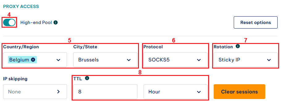 3. 访问 IPRoyal 控制面板以配置您的代理并获取您的凭据。我们将使用 比利时布鲁塞尔 (5) 的 高端 (4) 住宅代理,以及 SOCKS5 协议 (6) 和 粘性 IP 会话 (7) , 持续时间 (8) 为 8 小时。