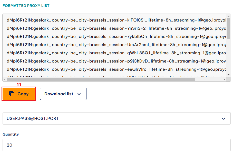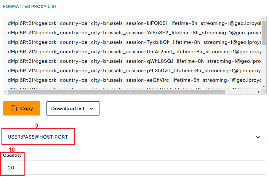 4. 向下滚动到 格式化代理列表 。确保在 格式 (9) 字段中选择 GeeLark 可以识别的格式。我们将使用 user:pass@host:port 格式。在 数量 (10) 字段中输入您需要的唯一会话数。