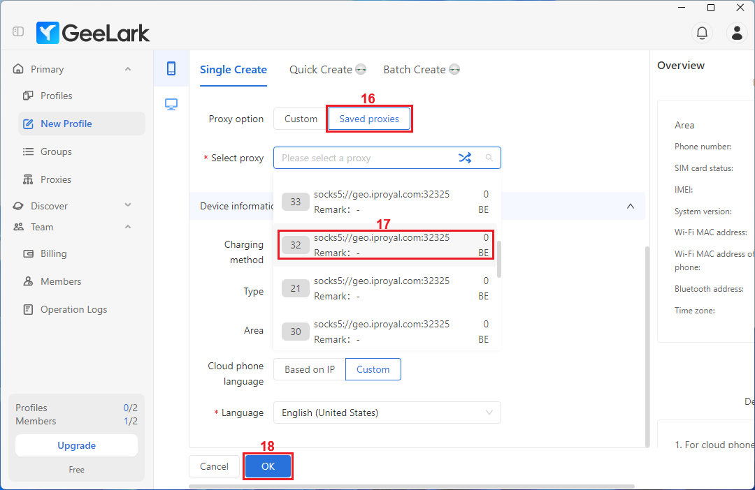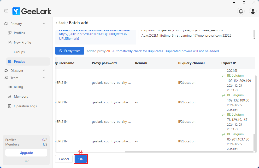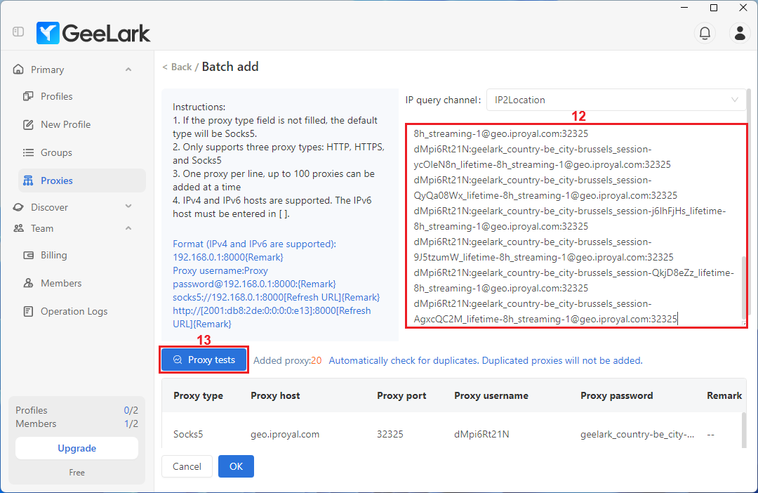 6. 返回 GeeLark 并将您的凭据粘贴到 字段 (12) 中。点击 代理测试 (13) 按钮以快速检查您的代理。