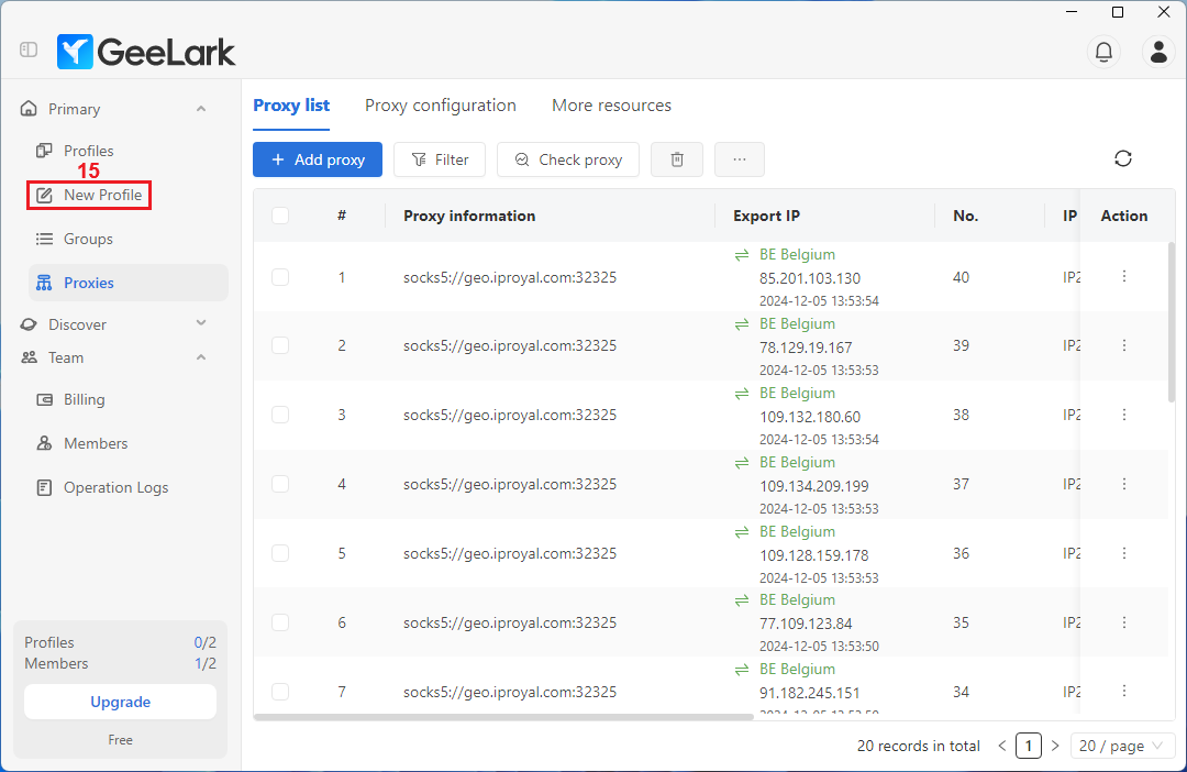 8. 如果您已经创建了配置文件,则可以开始向其中添加代理。如果没有,请点击菜单中的 新建配置文件 (15) 按钮。