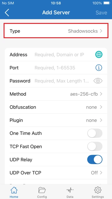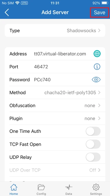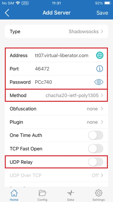 选择 Shadowsocks 类型,并使用我们提供的其中一个 Shadowsocks 服务器。输入您的服务器凭据:地址、端口和密码。选择“chacha20-ietf-poly1305”作为方法(Method),并关闭“UDP 中继”(UDP Relay)。