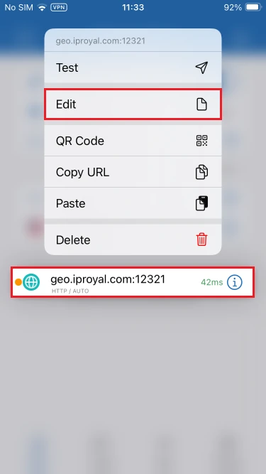 在 Shadowrocket 主窗口中,长按您的 IPRoyal 代理,并选择“编辑”(Edit)。