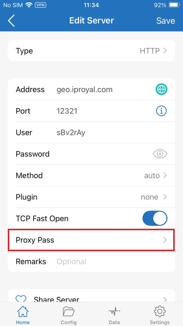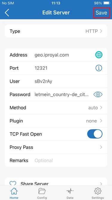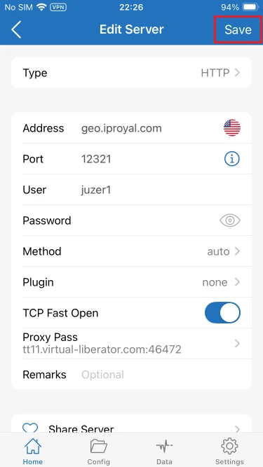 完成后,点击“保存”(Save)。请记住,您只能在 Shadowrocket 中结合 IPRoyal 代理使用这些代理。