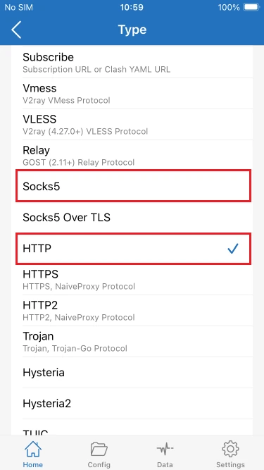 从列表中选择“HTTP”或“SOCKS5”,然后返回上一屏幕。