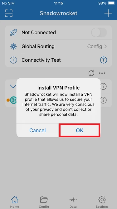 如果您是第一次使用 Shadowrocket,您的设备将提示您允许安装 VPN 配置文件。点击OK。