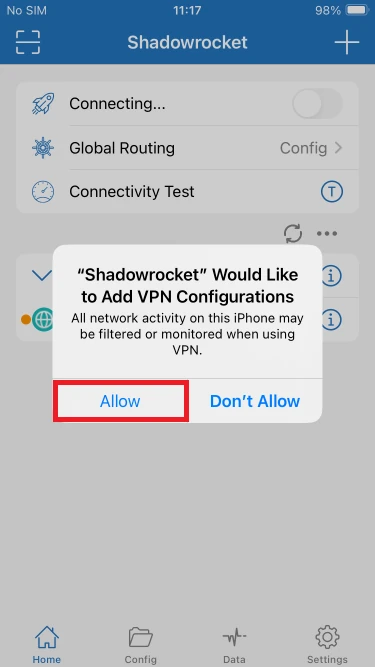 您还需要允许 Shadowrocket 添加 VPN 配置。点击“允 许”(Allow)。