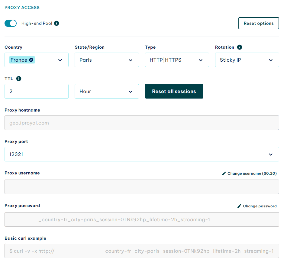 - 假设我们想与法国巴黎的高端IP创建2小时的粘性会话。我们会在IPRoyal控制面板中相应地配置我们的代理服务器。