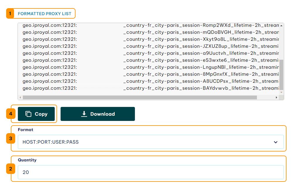 2. 完成代理服务器配置后,向下滚动到格式化代理服务器列表Formatted proxy list (1)。选择要使用的代理服务器数量Quantity (2)和格式Format (3)。请注意,IPRoyal代理服务器测试器支持当前所有格式。默认的IPRoyal控制面板和IPRoyal代理服务器测试器设置为主机名:端口:用户名:密码hostname:port:username:password。完成后单击复制Copy (4)按钮。